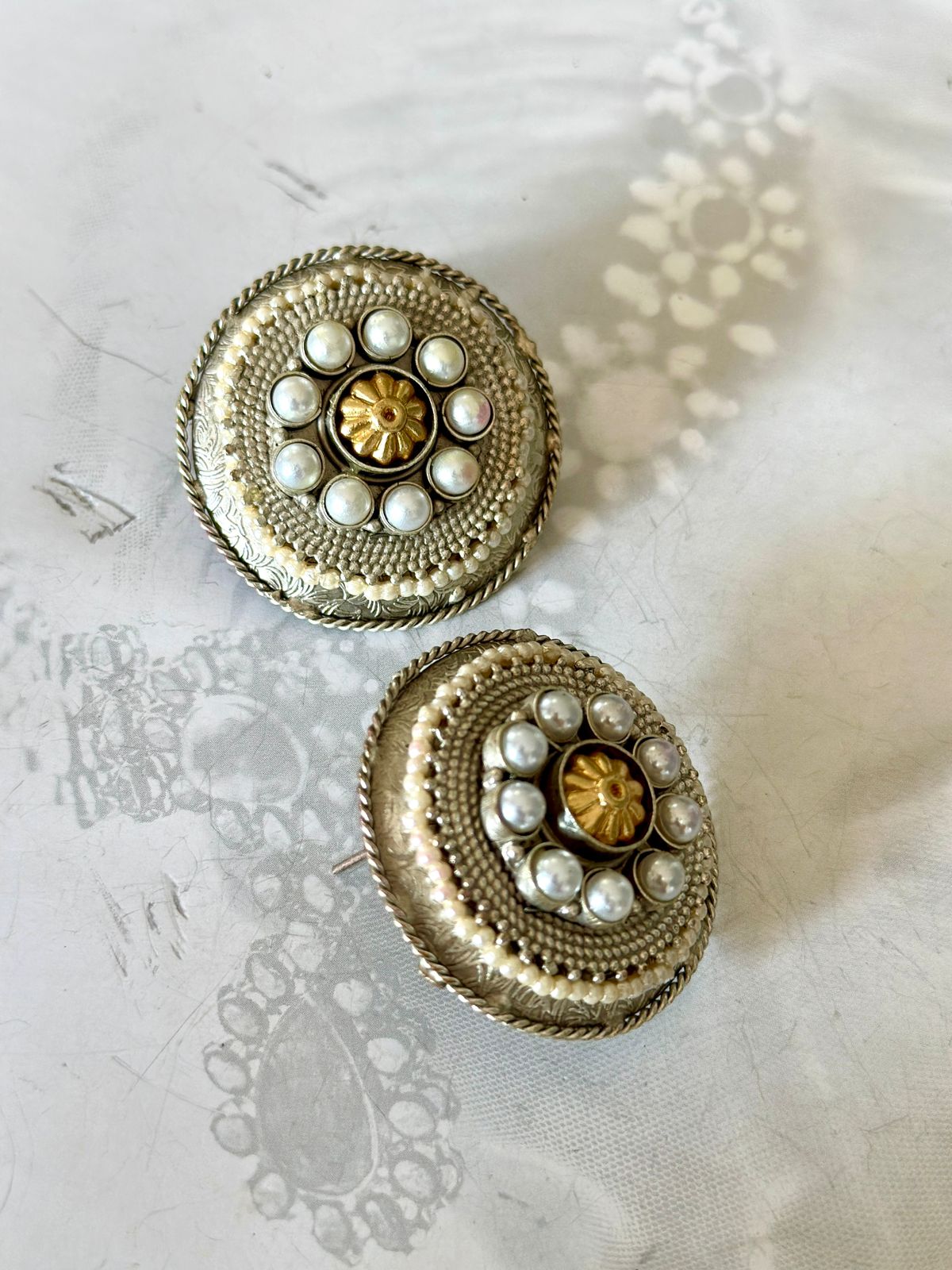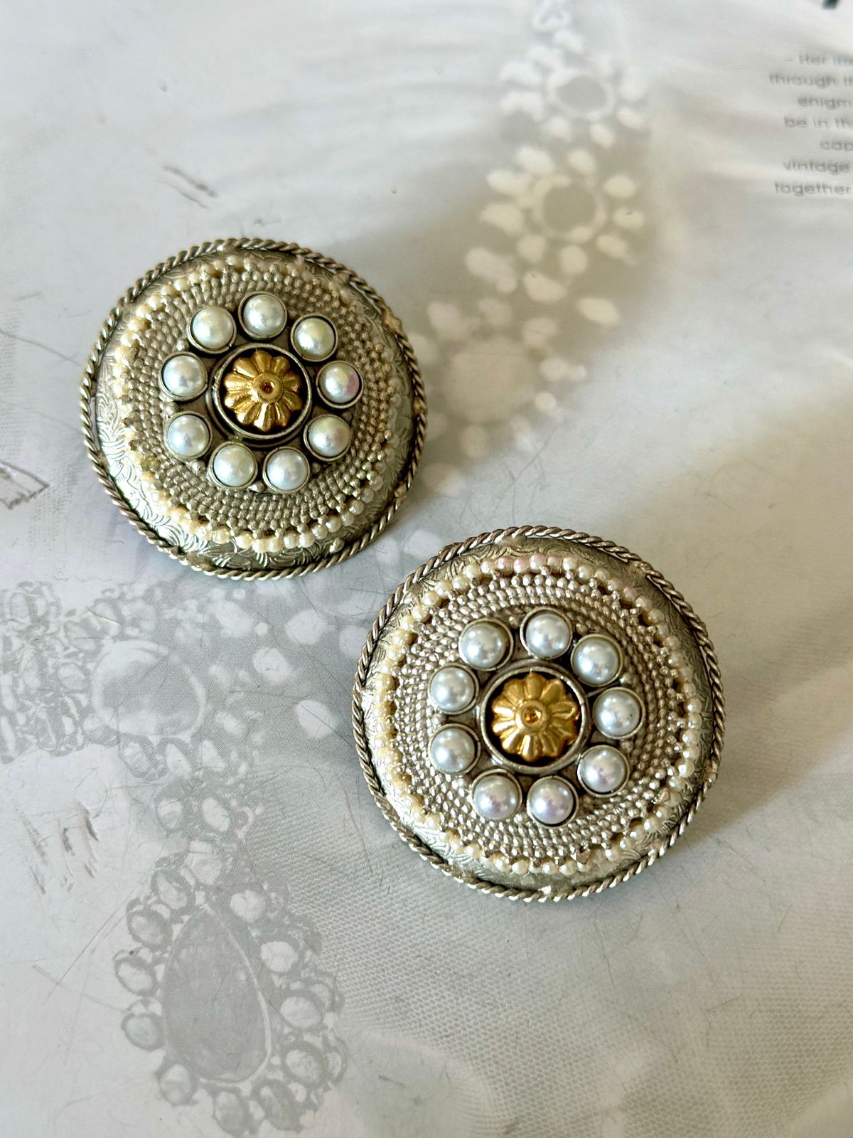 Silver finish antique look rounds big stud earrings in dual tone and pearls.
