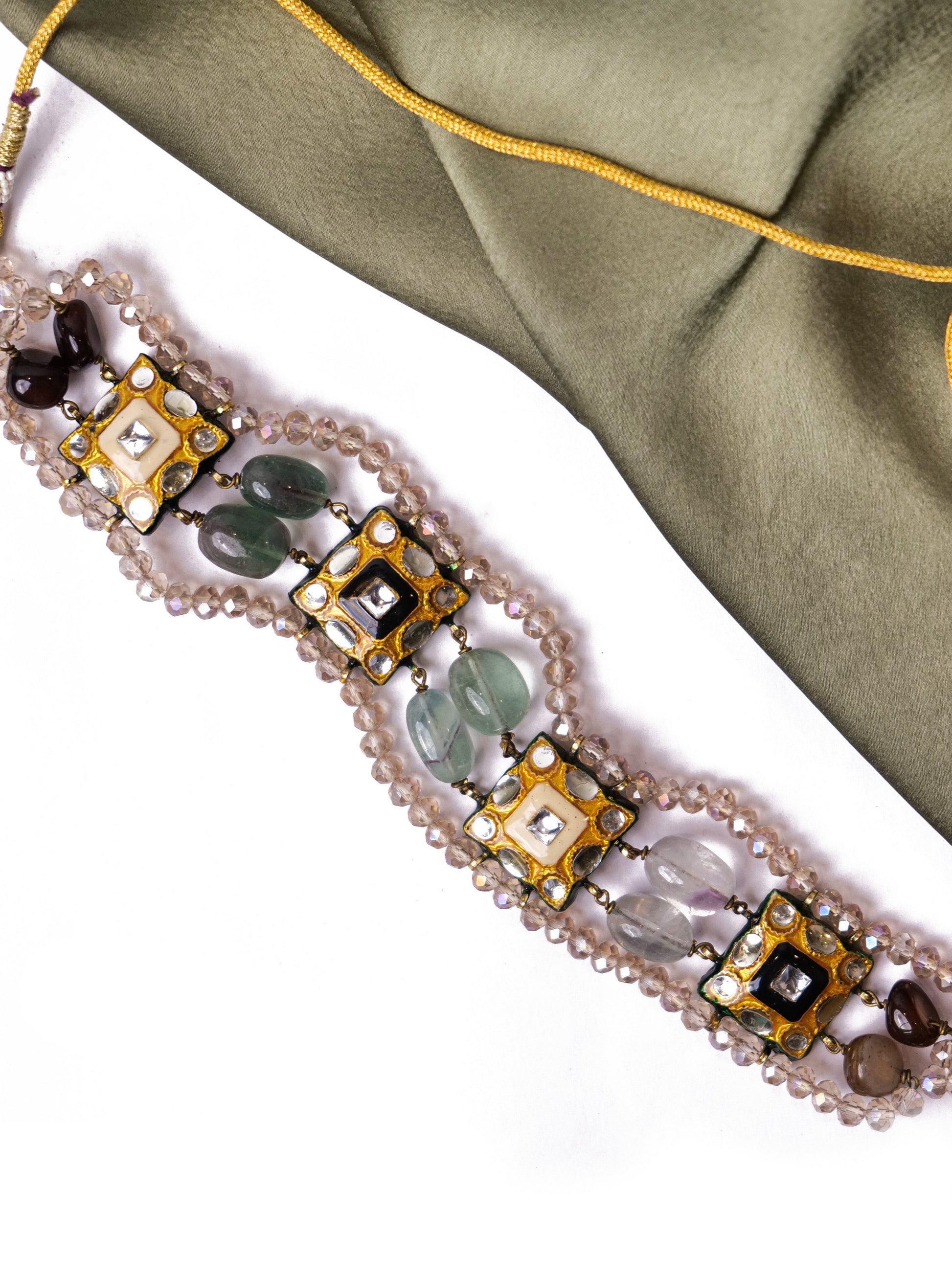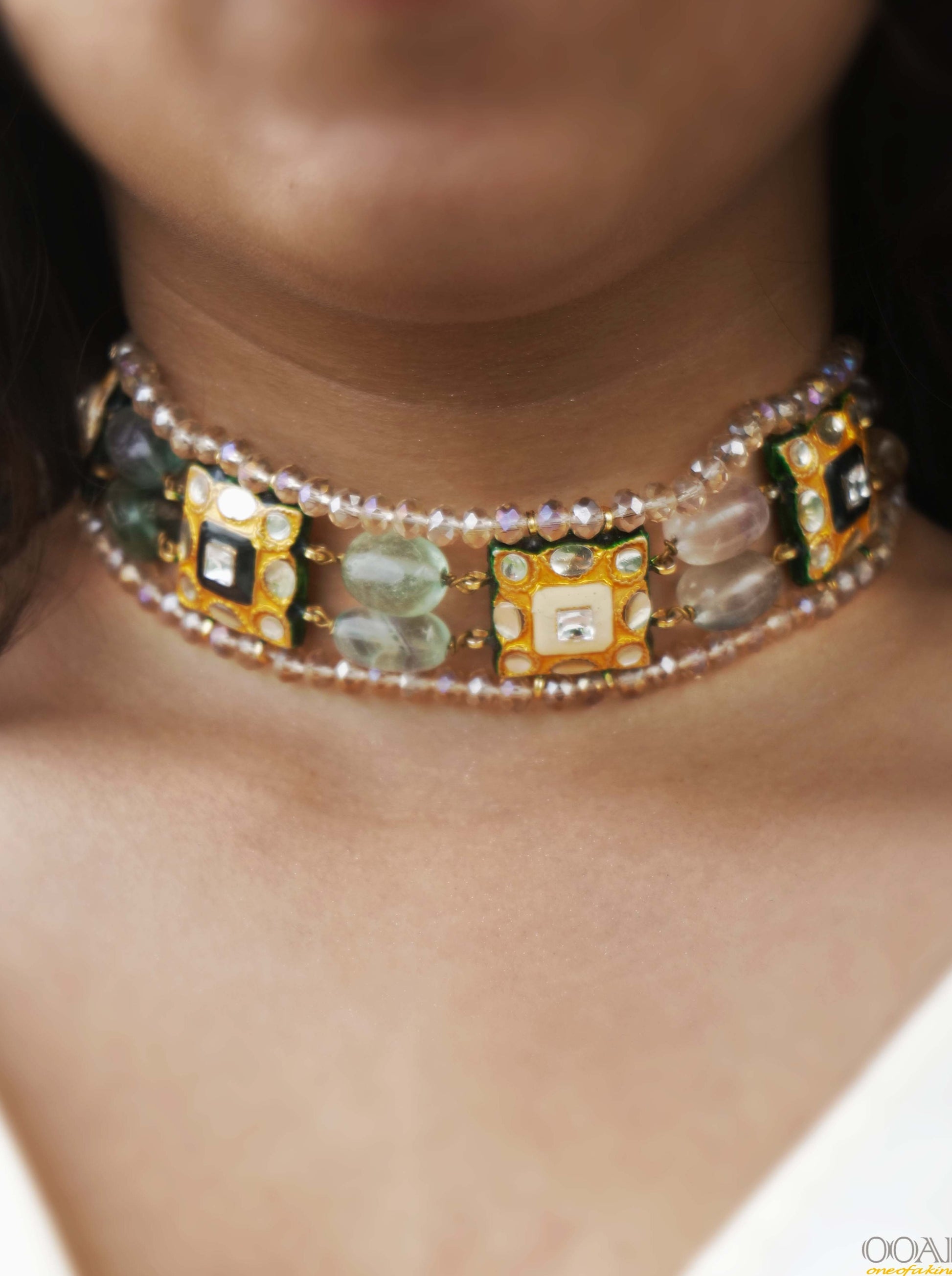Introducing our handcrafted choker featuring black and off-white enamel pieces adorned with multicolored pastel or neutral stones. This chic accessory effortlessly blends tradition with modern style.