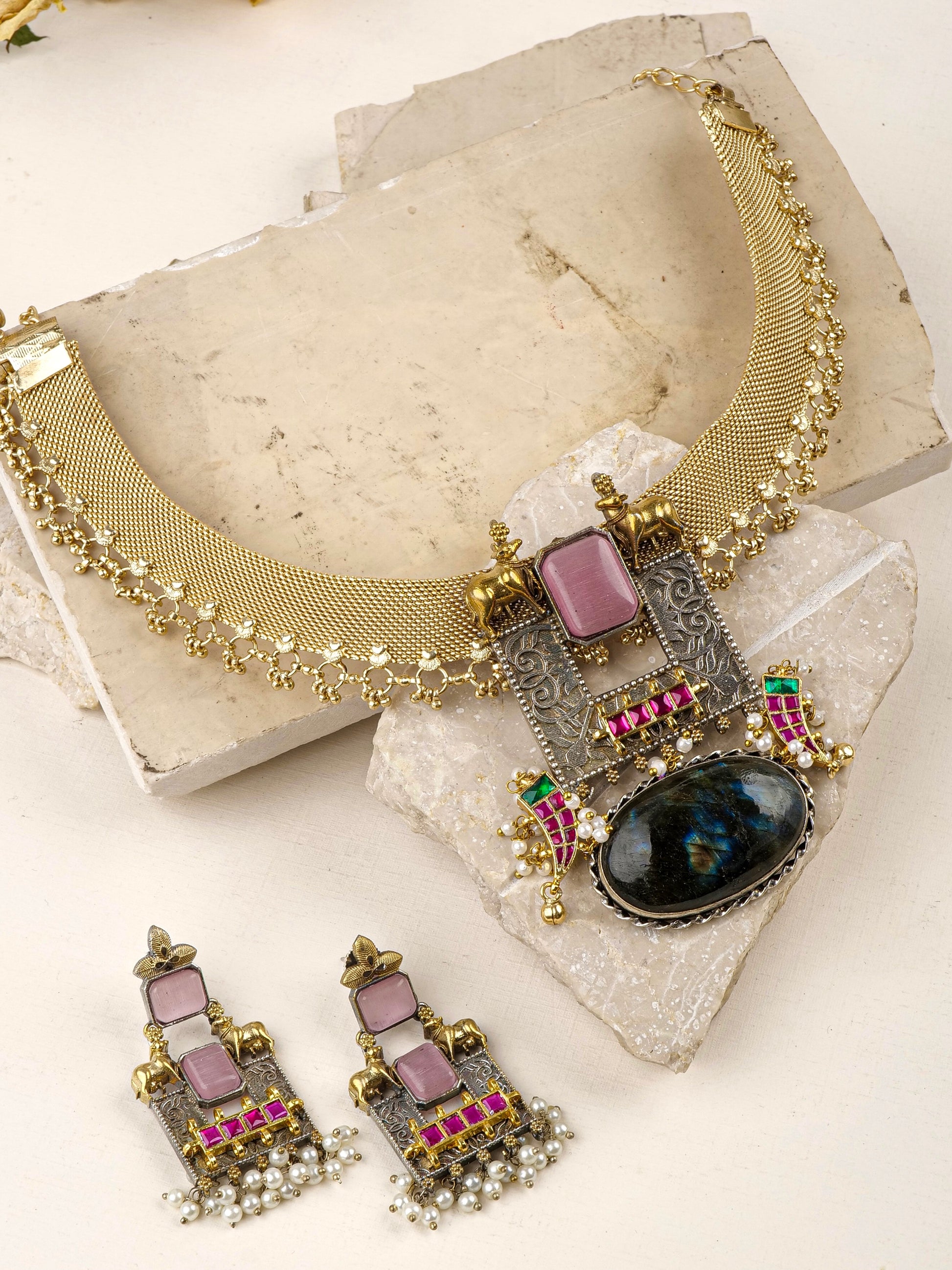 Fine quality near to neck necklace in gold plated mesh broad chain. Fusion oxidised pendant with nandi motifs, semiprecious stones and a big labrodite stone at the bottom, giving it a total indo-western look. Comes along with earrings.