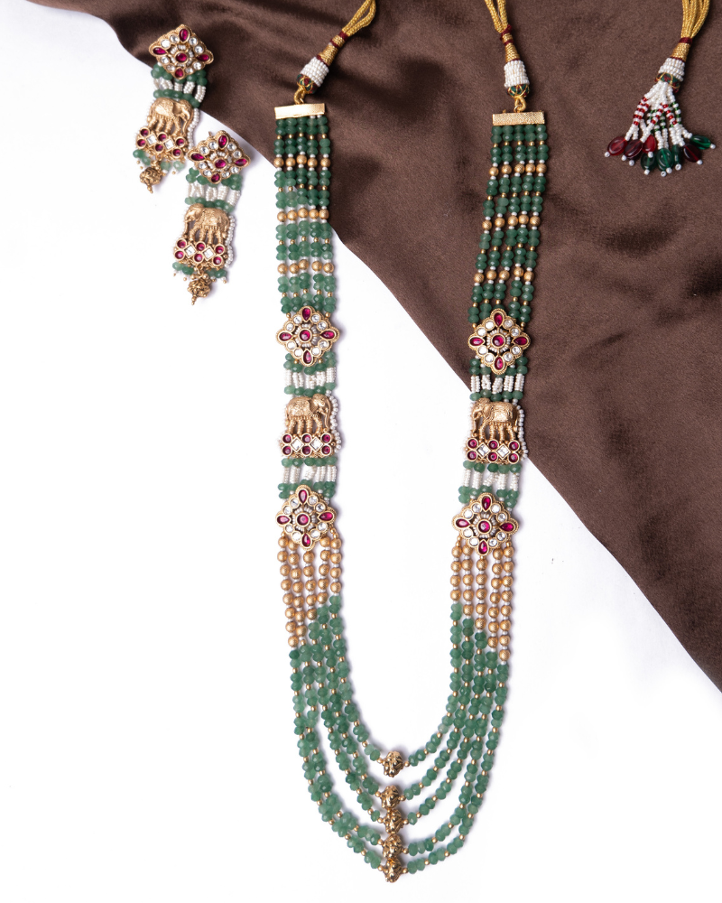Exuding understated luxury, this pendant showcases a matte finish and 18k gold plating, adorned with meticulously crafted elephant motifs in kundan polki work, accented by radiant semiprecious red stones. A testament to timeless elegance.