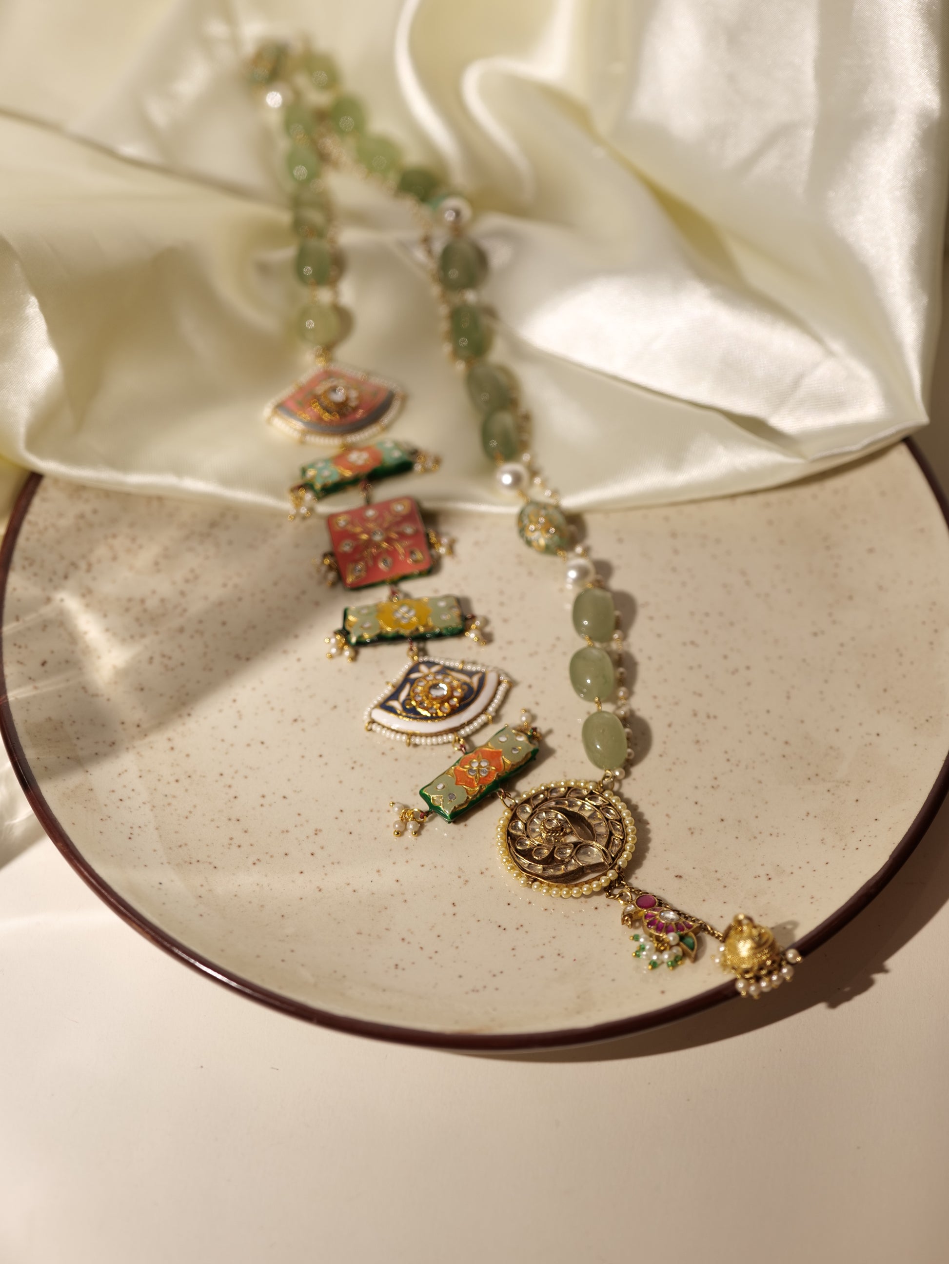 One of a kind long neckpiece with multiple meenakari and kundan motifs on one side and semiprecious fluorite green stone on other.