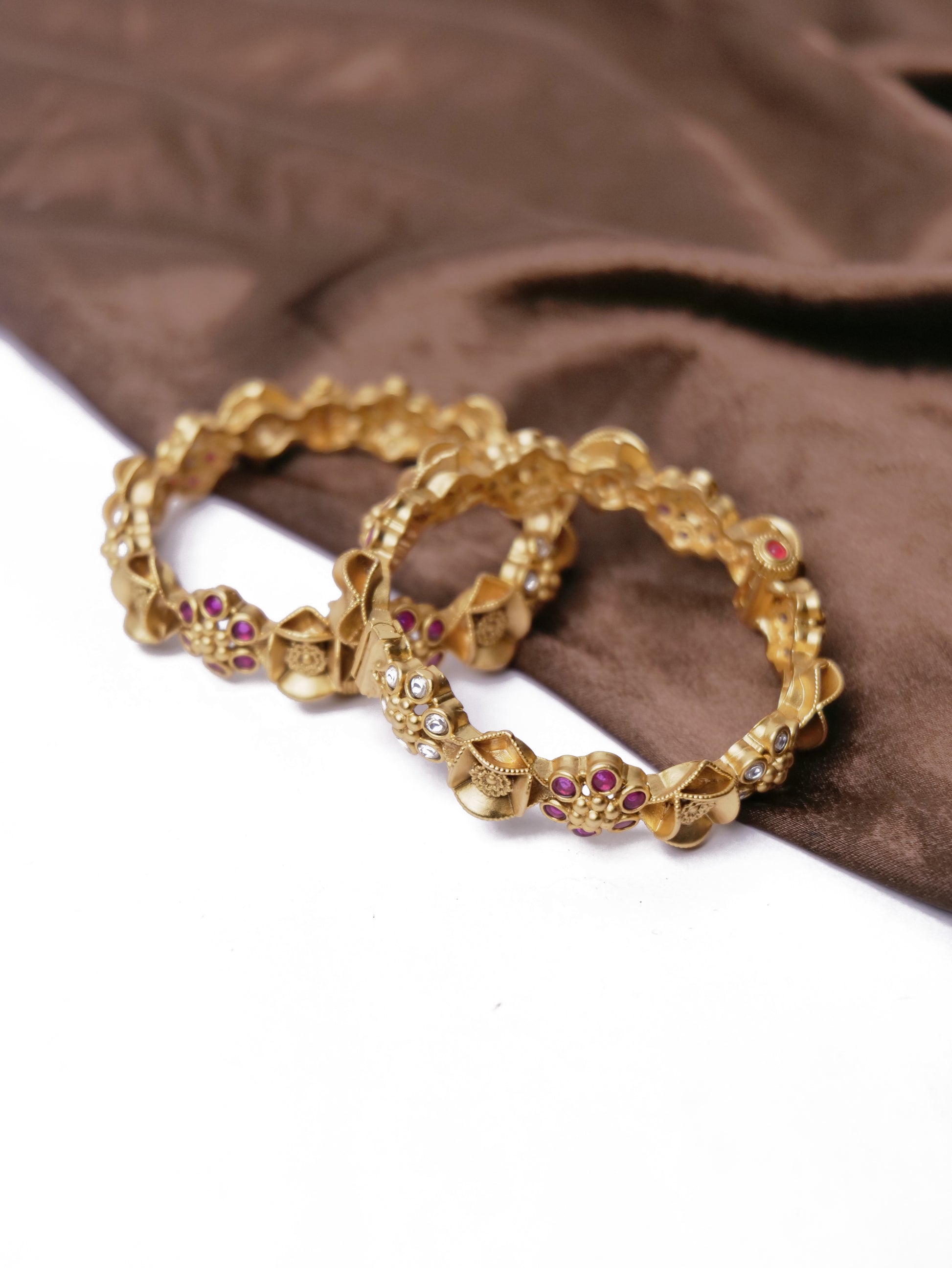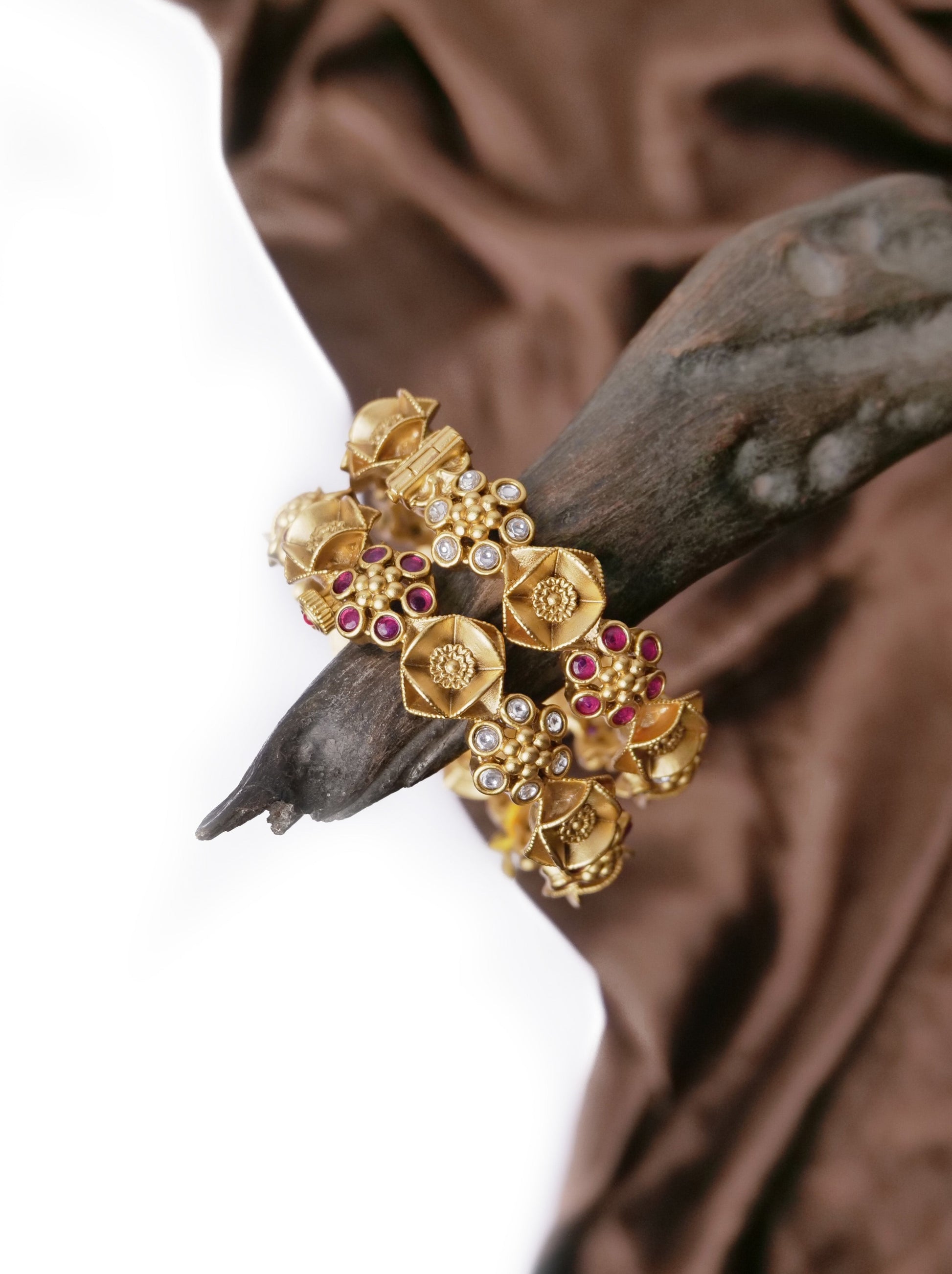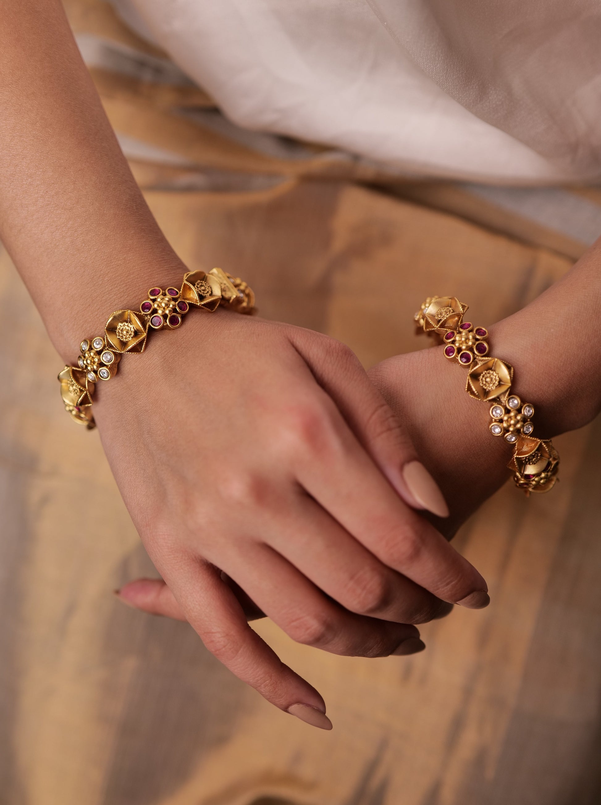 A timeless piece that captures the essence of blooming romance. This exquisite kada in antique look with 18k gold plating and semiprecious stones, exudes elegance and sophistication. Crafted with meticulous attention to detail, the antique finish enhances the allure of the piece.