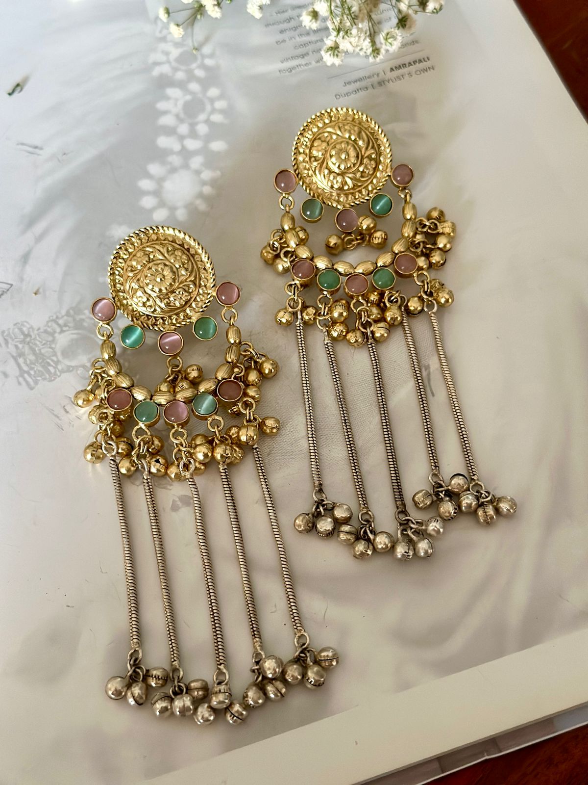 Fusion earrings in dual with 18k gold plating, semiprecious stones in green and pink, silver chains with ghungroo hangings.