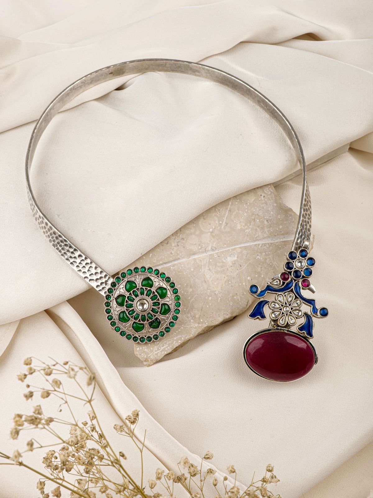 Fine quality oxidised look silver finish antique hasli, with multiple motifs with semiprecious stones, giving it an indo- western look.