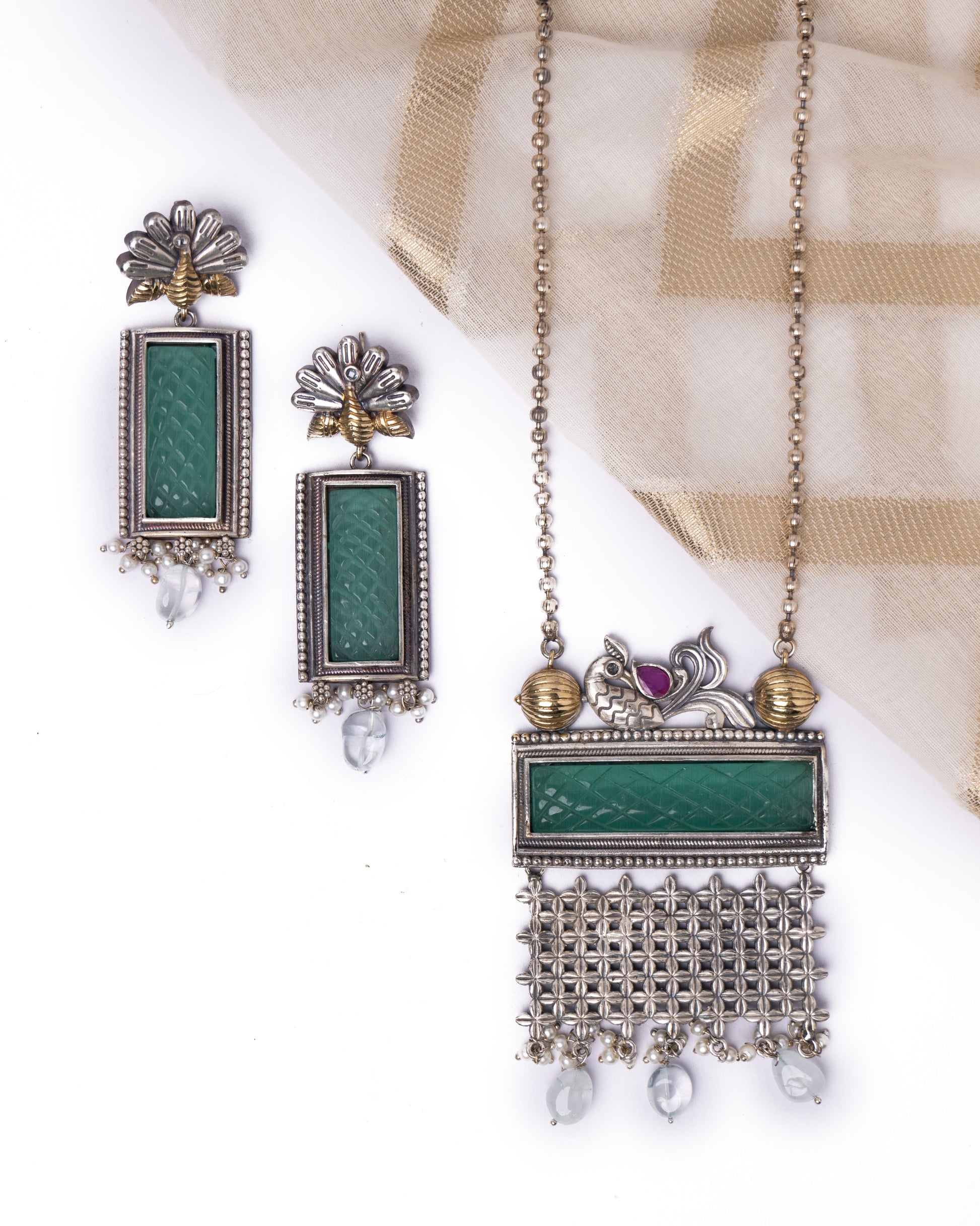 The set includes an intricately designed necklace, adorned with semiprecious jade carved stone in green, exuding an opulent aura. The matching earrings complement the necklace, featuring a perfect blend of traditional craftsmanship and contemporary design.