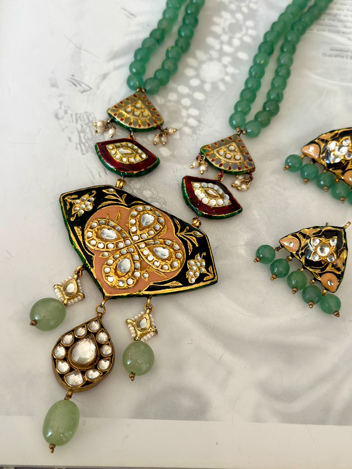 Statement 18k gold plated antique look necklace set with earrings. fine quality traditional meenakari mofits designed beautifully with kundan polki motifs giving it a unique statement look, attached with green stone double string.Comes along with stud earrings.
