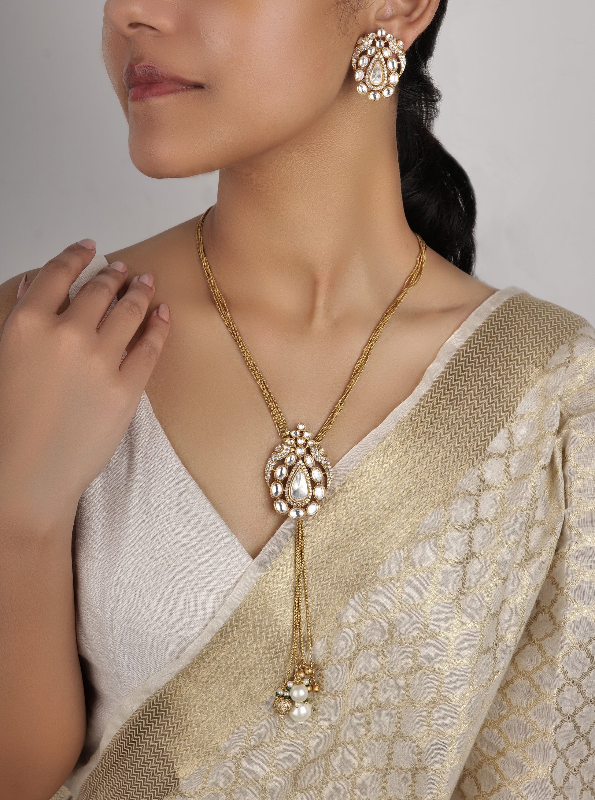 Fine quality moissanite polkis pendant set with cz’s ( cubic zircons) and cluster gold plated chains.the pendant is movable and can be be adjusted according to choice.