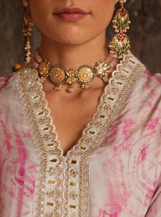 Adorn yourself in the vibrant allure of our handcrafted multicolored choker. This exquisite piece features meenakari/enamel and kundan motifs, accentuated with semiprecious stones.