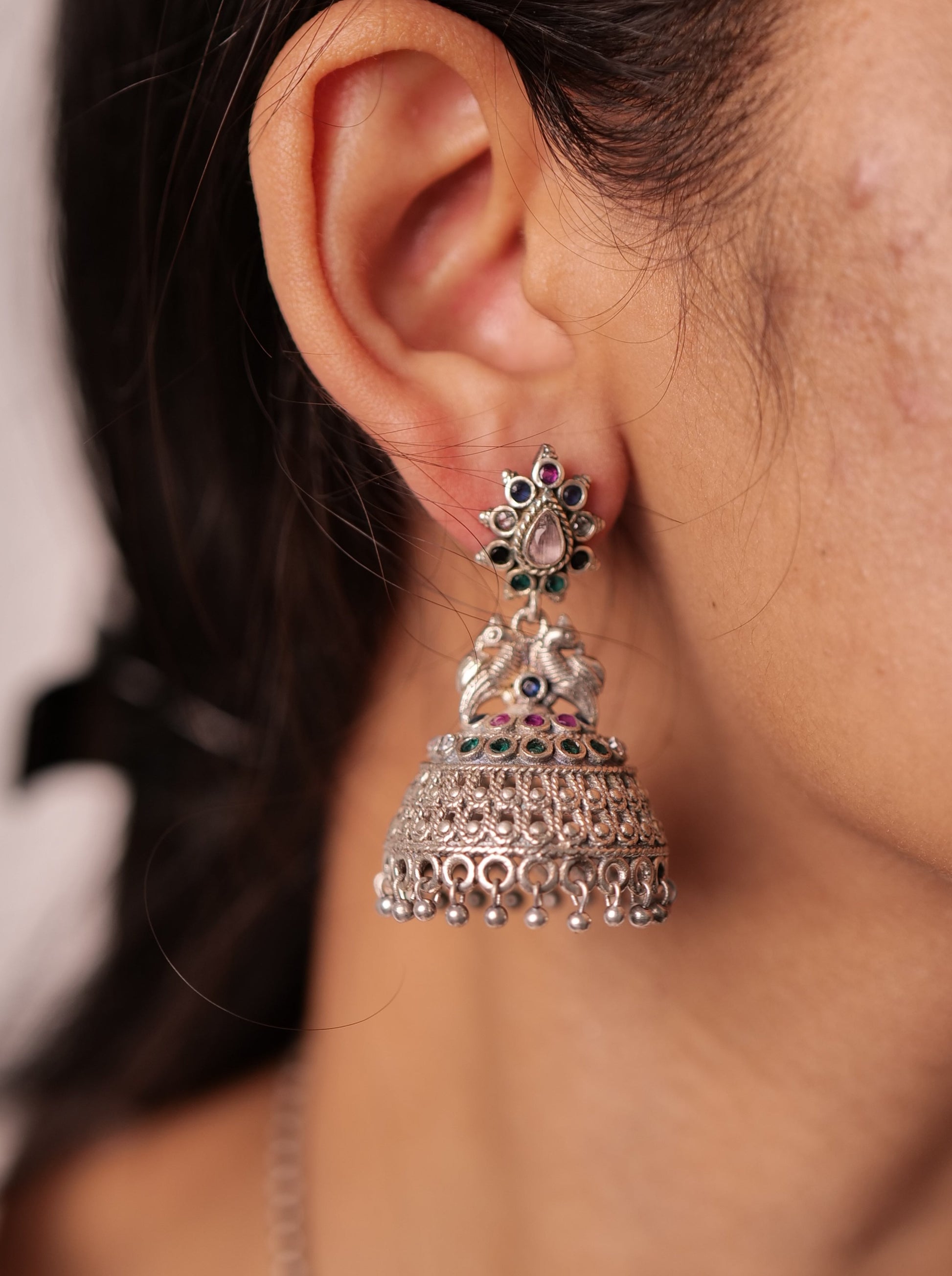 Oxidised silver finish jhumkis in intricate finish with semiprecious stones.