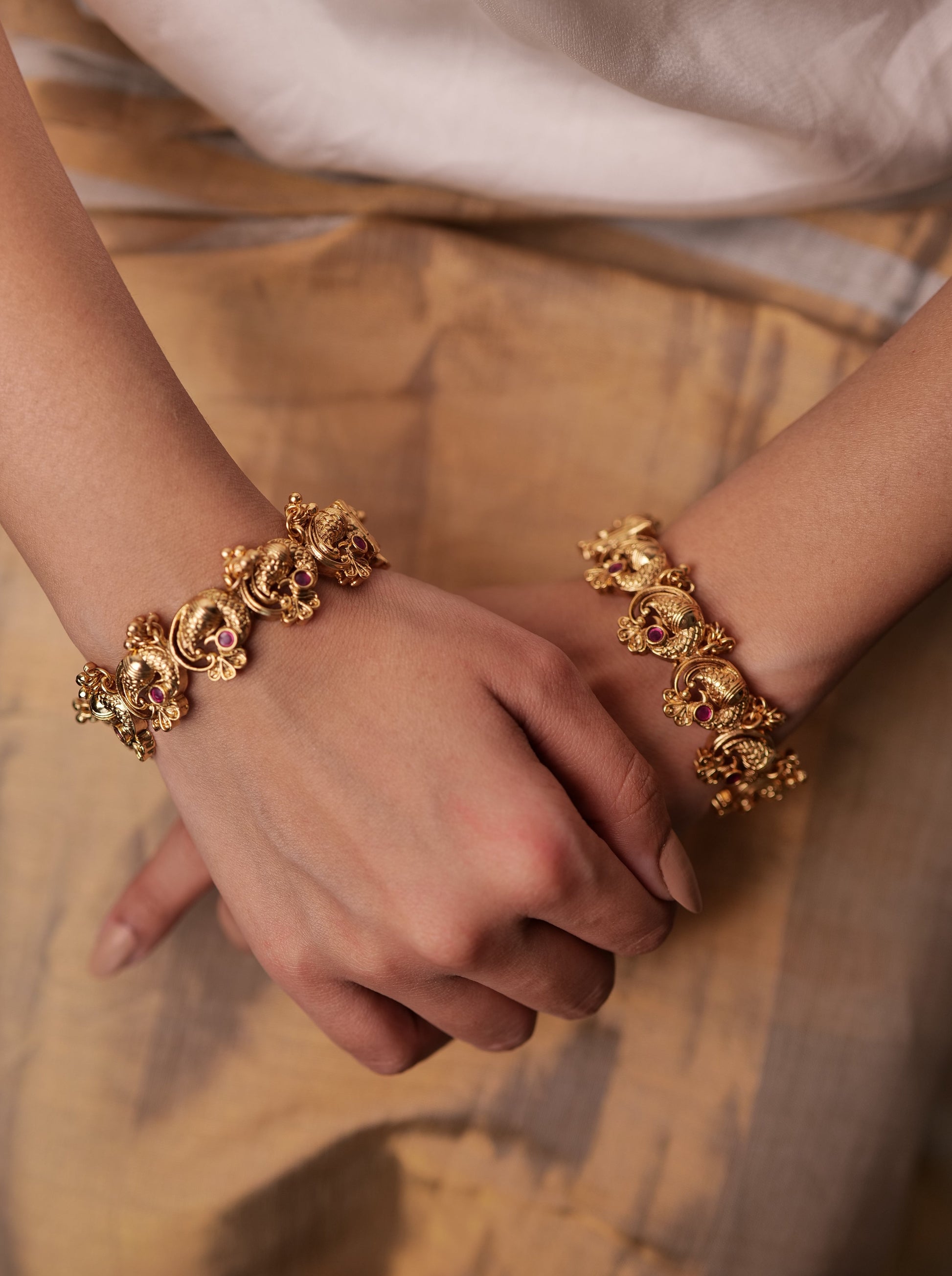 A divine fusion of antiquity and modern glamour. These exquisite 18k gold-plated bangles in antique look, named after the Rani's of India, showcase a captivating interplay of peacock motifs and semiprecious stones with small ghungroo hangings