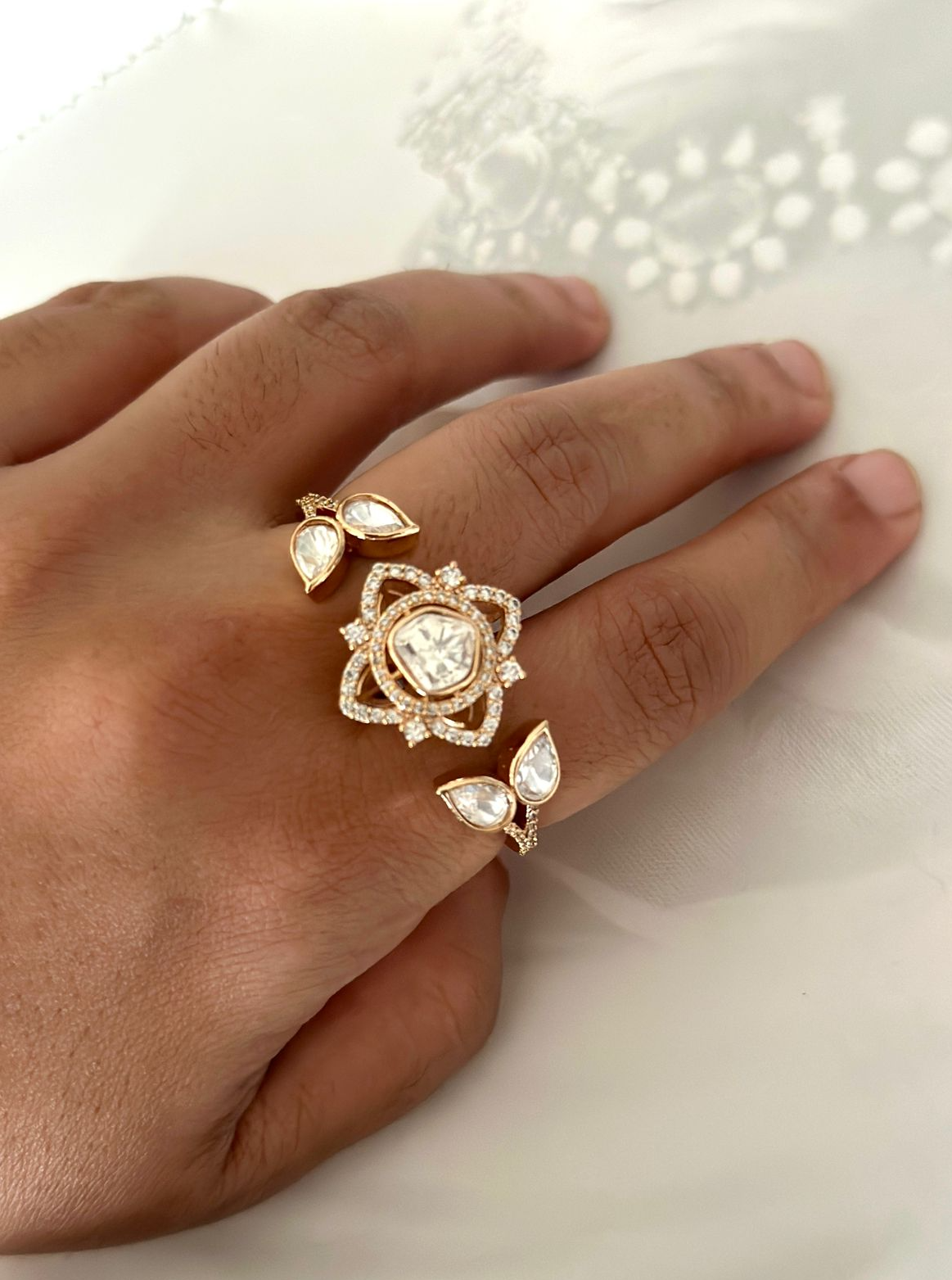 Fine quality 18k gold plated double ring with faux polki ( look alike uncut diamonds) and cubic zircons with seprecious stones.