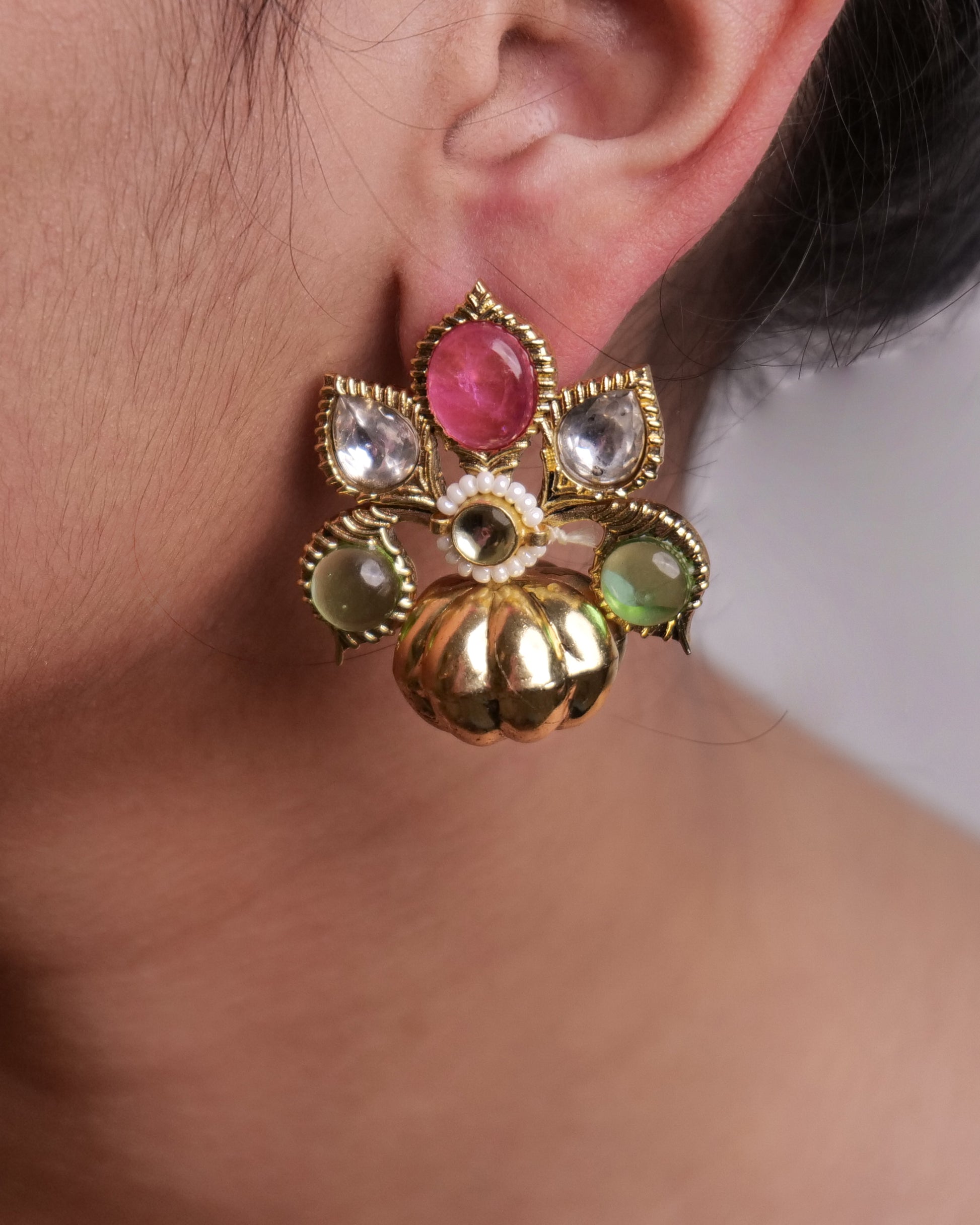 Step into timeless elegance with our uniquely designed silver-finish antique studs. Adorned with exquisite stones and kundan embellishments, these studs are a perfect blend of vintage charm and modern sophistication