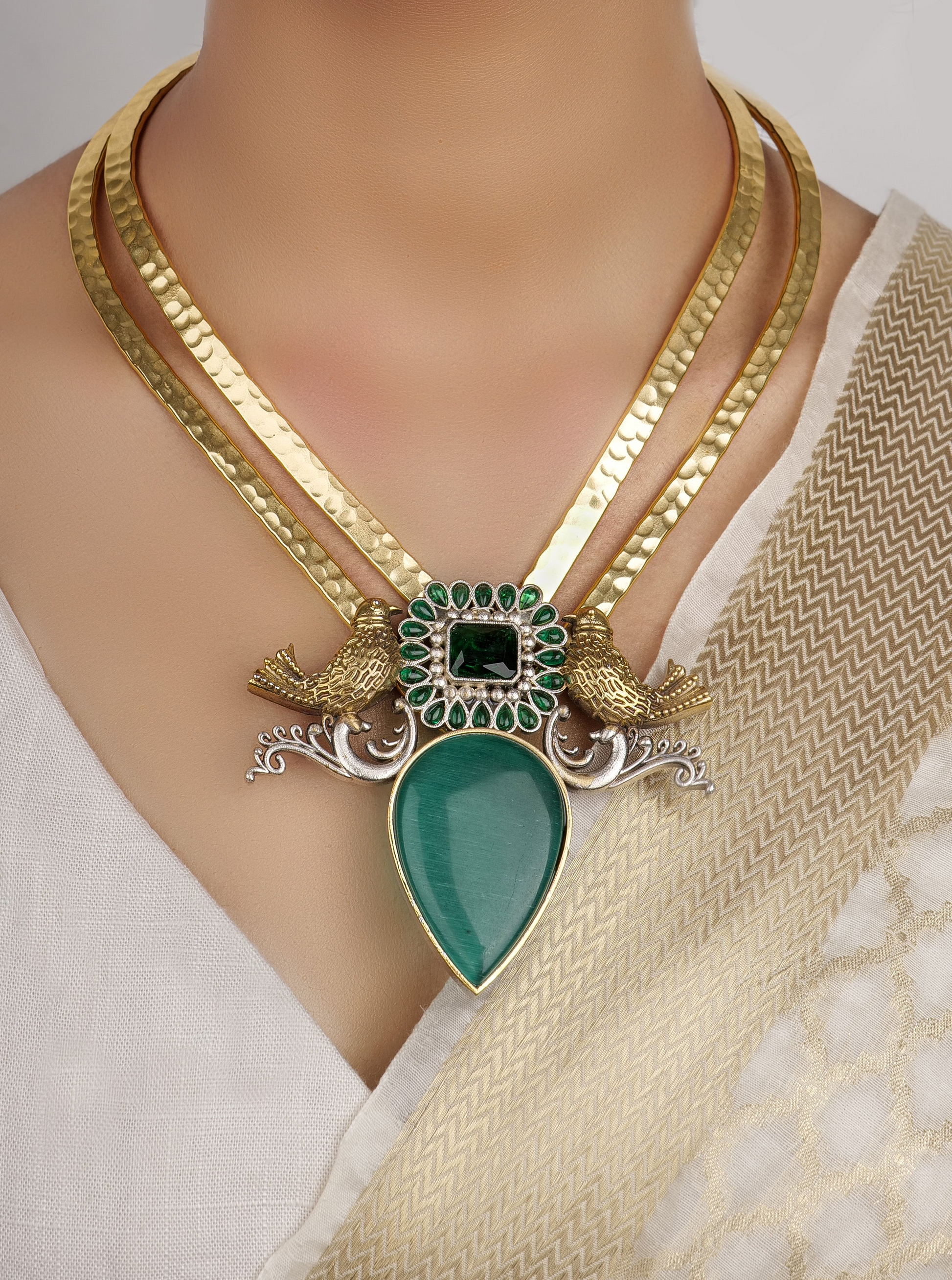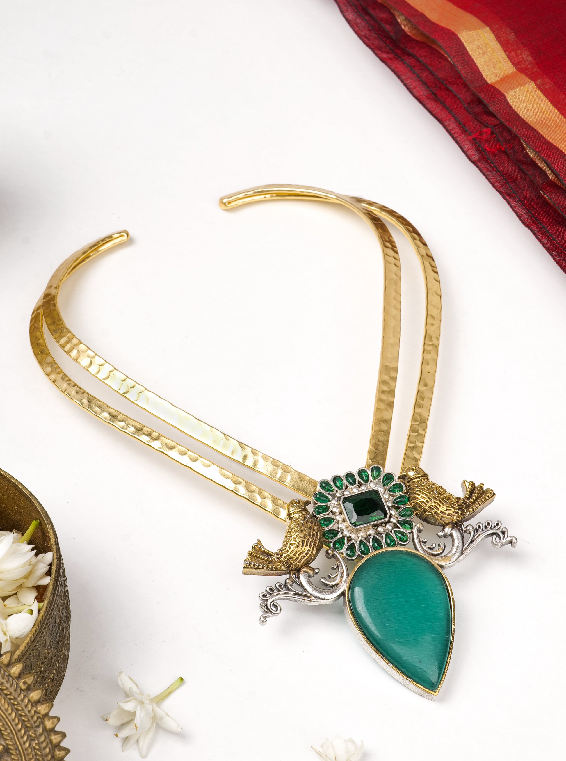 Antique look statement flexible hasli necklace in dual tone with parrot motifs and green stone pendant.
