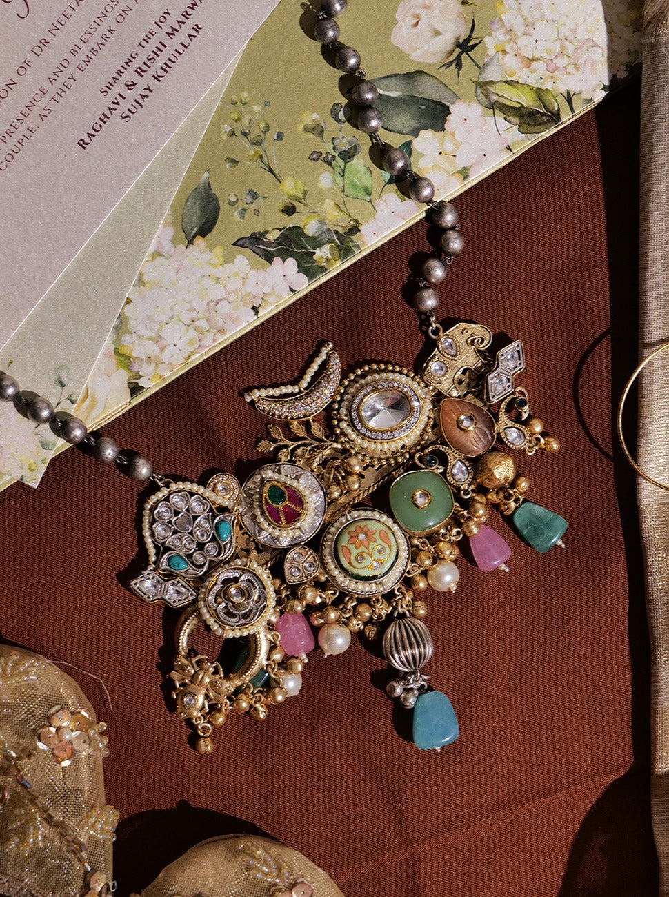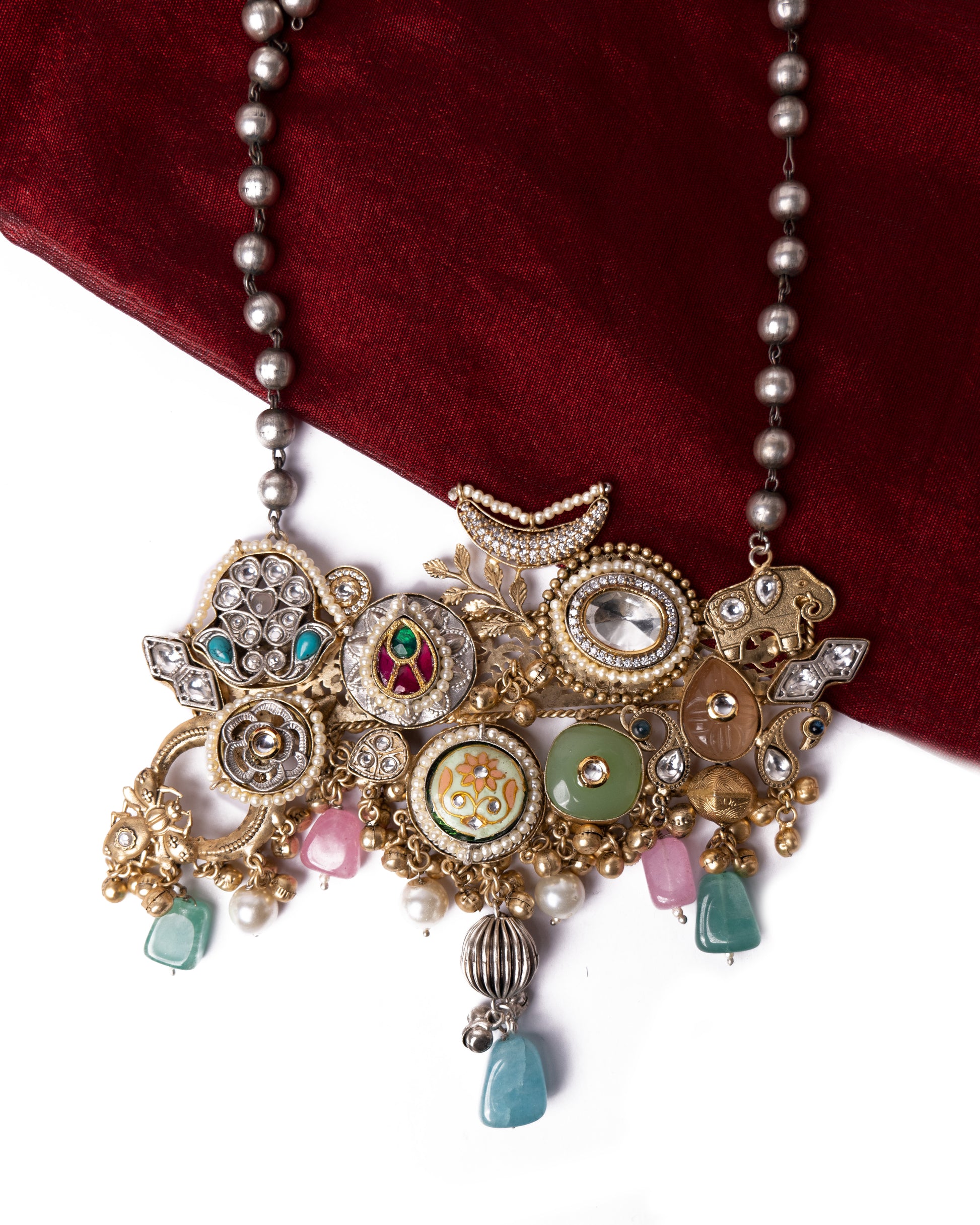 Statement heavy look pendant in antique gold tone with multiple motifs of meenakari, kundan ,polki, ghungroo and stone hangings, attached to oxidised silver chain