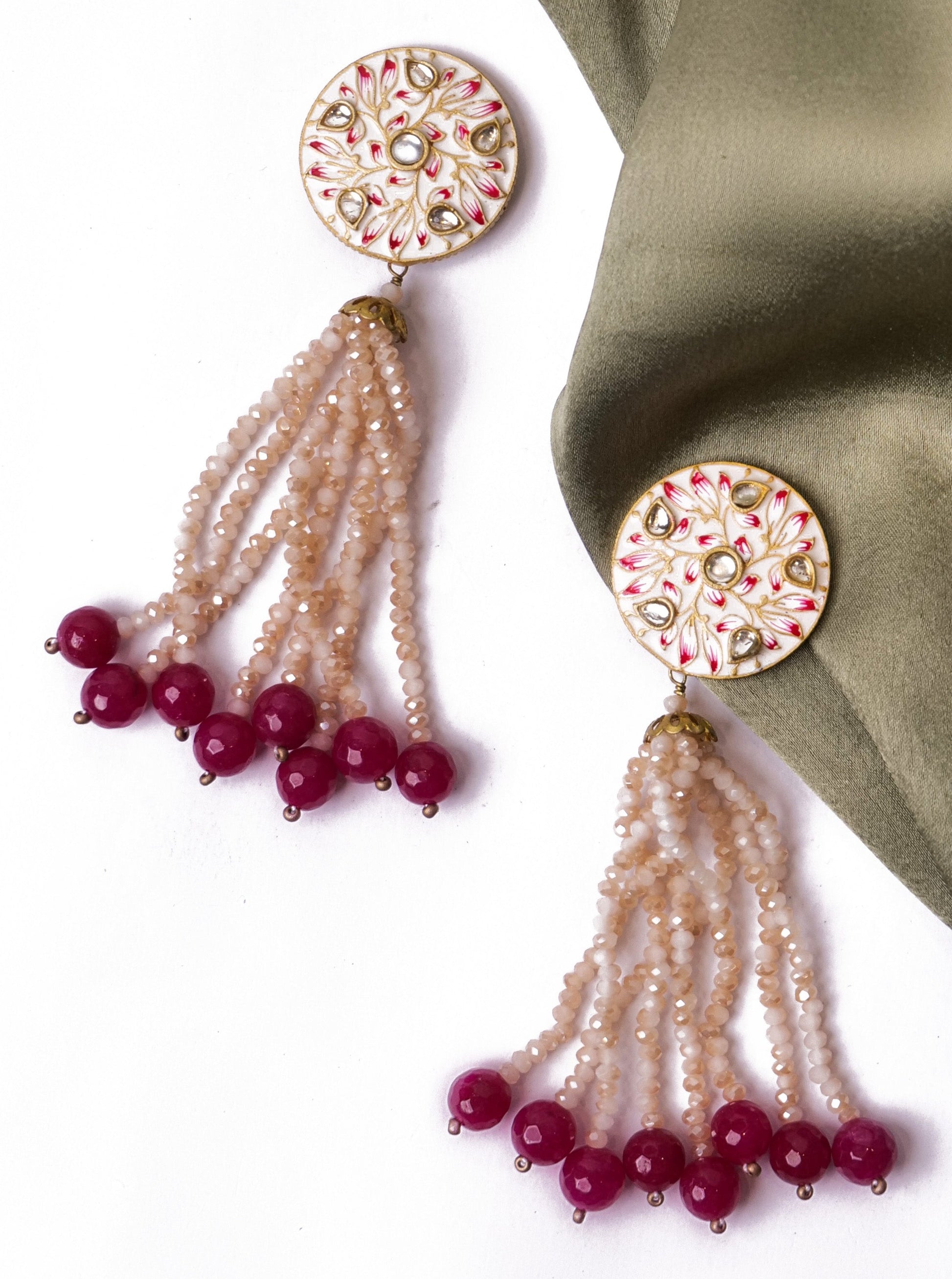 Adorn yourself with elegance in our white and pink enamelled/meenakari earrings featuring kundan embellishments. Complete with charming tassels and stone hangings, these earrings are a perfect blend of grace and sophistication.